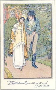 Emma è stato, anche di recente, oggetto di numerosi articoli critici concentrati sull’uso del linguaggio nelle opere di Austen. Questo romanzo interpreta, come solo la grande letteratura sa fare, quel delicatissimo rapporto tra parola e silenzio che rende un libro semplicemente immortale, perché permette ai suoi fruitori (i lettori) una sconfinata libertà di interpretazione. La teoria decostruzionista può essere considerata l’ispiratrice di questi interventi, perché è un movimento critico che si è dedicato al modo in cui il linguaggio ha costituito il significato attraverso il gioco delle differenze, degli “errori” e dei vuoti di significante. Parlando proprio di Emma, pensiamo ai giochi di e con le parole in cui i personaggi si intrattengono e ai fraintendimenti che generano, così importanti per lo sviluppo della vicenda narrata. La sconfinata mole di linguaggio che riempie le pagine di Emma fa in modo che la protagonista sia, come sostiene Francesco Marroni, “wholly involved in language” (“totalmente compresa nel linguaggio”. In: Jane Austen’s Emma. Revisitations and Critical Contexts, a cura di F. Marroni e G. Lauri-Lucente, “Riverrun”, Aracne, 2011, p. 18) e arriva a far ritenere che “Austen’s heroine and language are one and the same thing. […] Emma can be equated to the language she produces” (“l’eroina austeniana e il linguaggio sono la stessa cosa. […] Emma può essere paragonata al linguaggio che produce”. Ibidem). Per contrasto, i passi in cui è il silenzio a prevalere assumono una eccezionale rilevanza. La scena della dichiarazione d’amore di Mr. Knightley (vol. III, cap. 13. Cito la traduzione di G. Ierolli), che si colloca a parer mio tra i momenti più alti e insieme più moderni della scrittura austeniana, ne è una perfetta dimostrazione. Il dialogo tra lui ed Emma è infarcito di pause e sospensioni (anche grafiche: trattini e puntini) e di riferimenti al “non dire”, tanto che la reciproca comprensione è persino minacciata da un’interruzione: